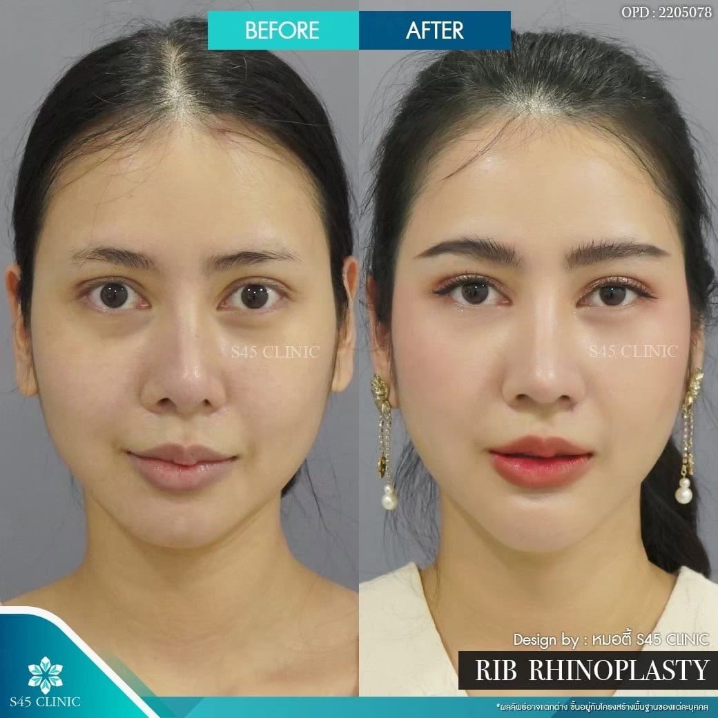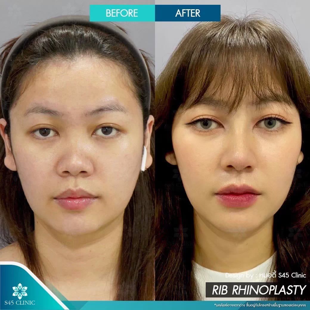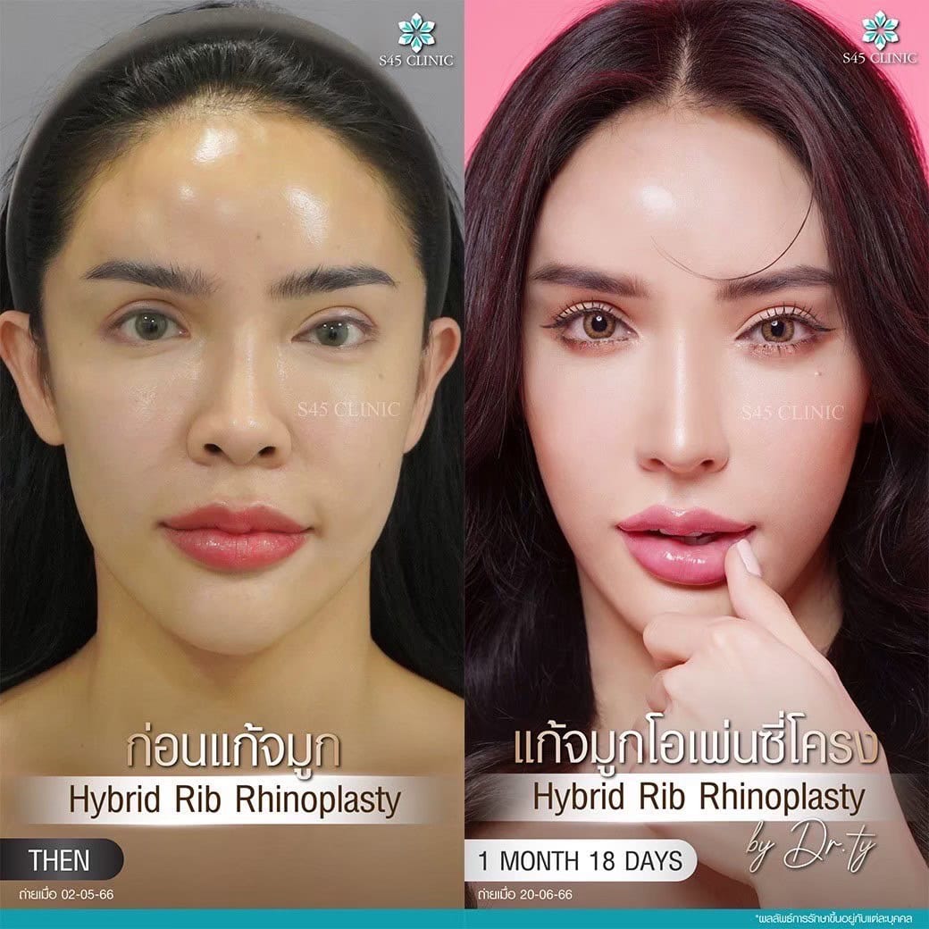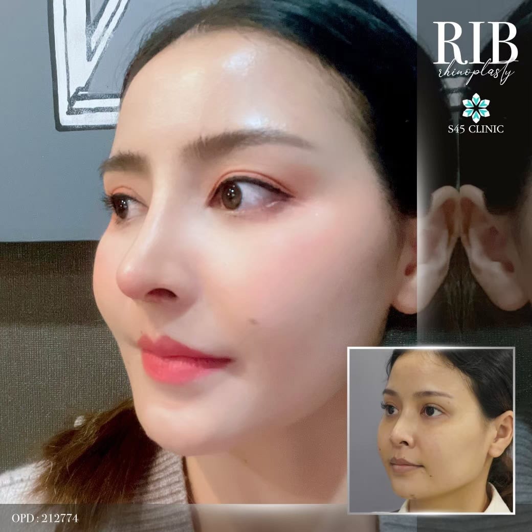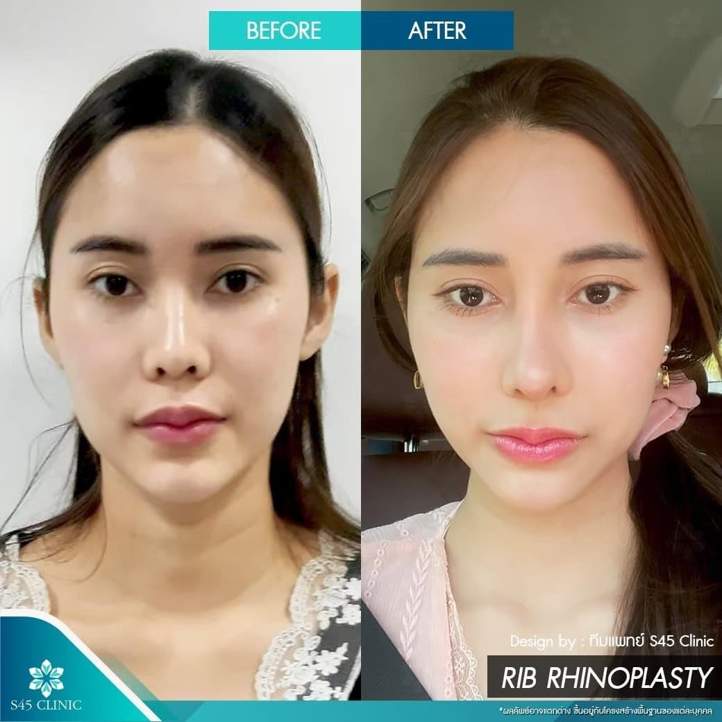 “จากเดิมจมูกสั้นและปลายรั้ง ตอนนี้พุ่งสวยเข้าที่แล้ว เทคนิคที่คุณหมอใช้ นั่นก็คือ ใช้กระดูกซี่โครงตัวเองร่วมกับแก้ไขโครงสร้างจมูกค่ะ ทำให้ปลายพุ่ง โครงสร้างจมูกยาวขึ้น โดยรวมมองแล้ว รับกับหน้าผาก คางและทรงปากเลยทำให้รูปหน้าเปลี่ยน ทั้งๆ ที่ทำจมูกอย่างเดียวเลย”