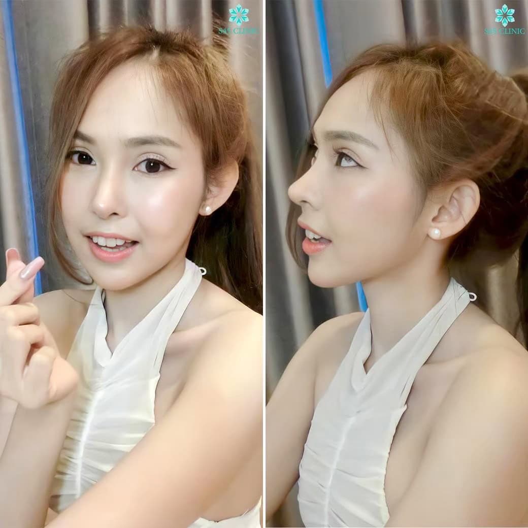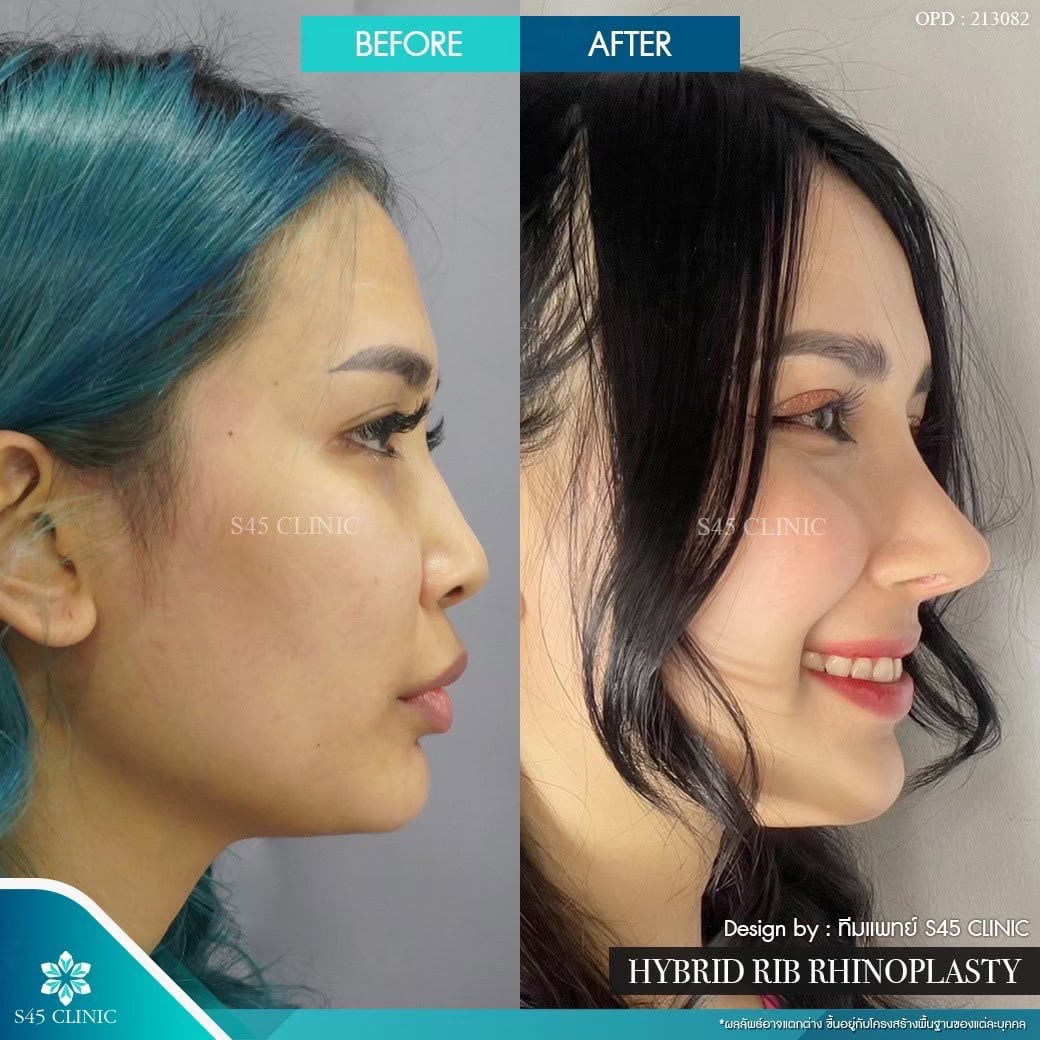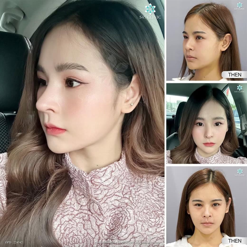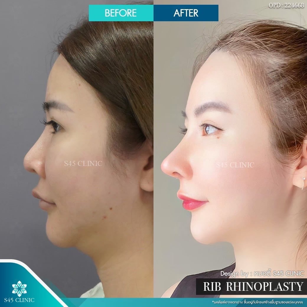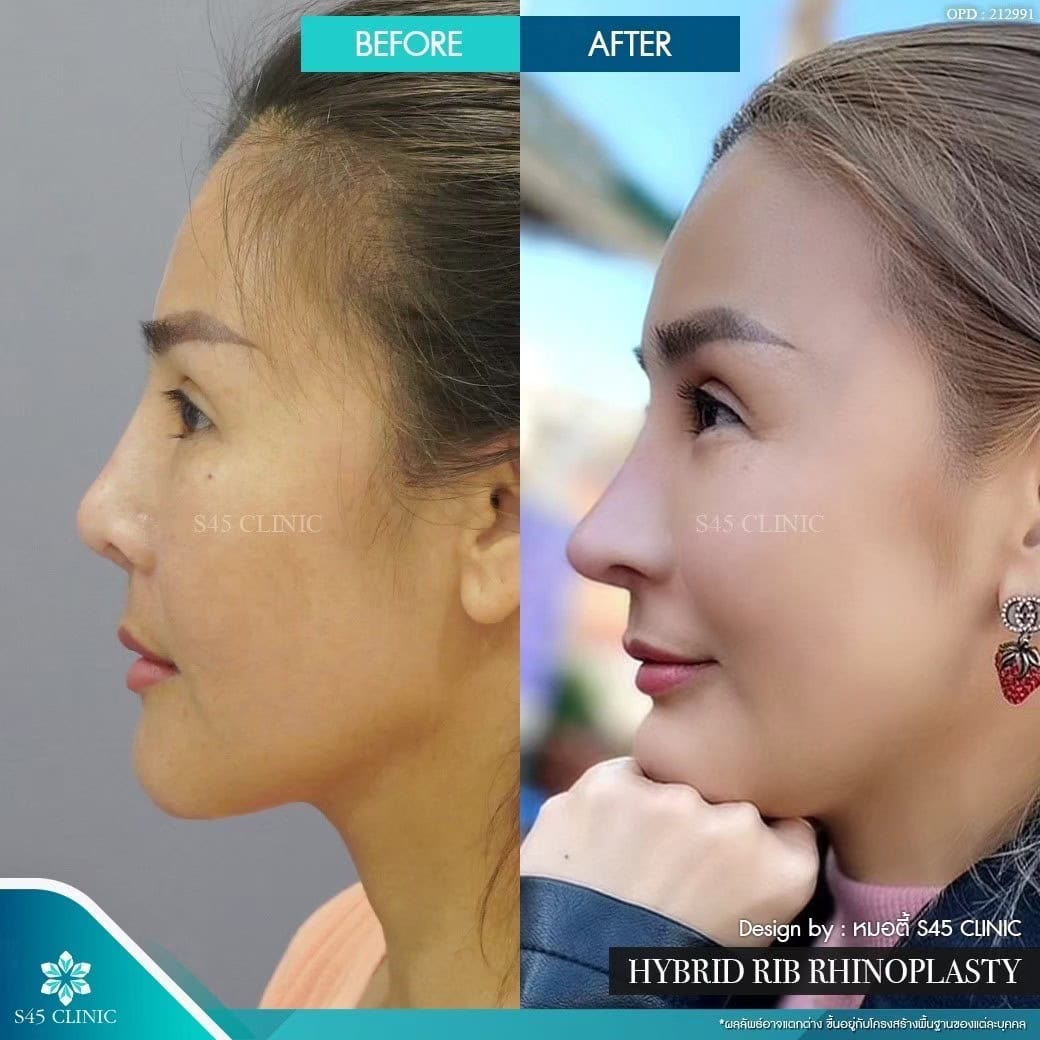 “จากเดิมจมูกสั้นและปลายรั้ง ตอนนี้พุ่งสวยเข้าที่แล้ว เทคนิคที่คุณหมอใช้ นั่นก็คือ ใช้กระดูกซี่โครงตัวเองร่วมกับแก้ไขโครงสร้างจมูกค่ะ ทำให้ปลายพุ่ง โครงสร้างจมูกยาวขึ้น โดยรวมมองแล้ว รับกับหน้าผาก คางและทรงปากเลยทำให้รูปหน้าเปลี่ยน ทั้งๆ ที่ทำจมูกอย่างเดียวเลย”